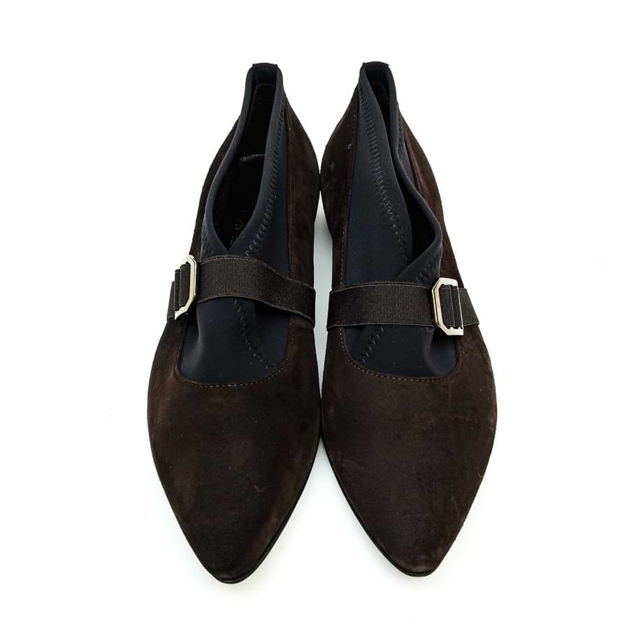 Špicasta cipela izrađena u velur koži braon boje u kombinaciji sa tekstilom u crnoj boji. Unutrašnjost je postavljena kožom. Đon je od gume. Visina pete je 2 cm.
