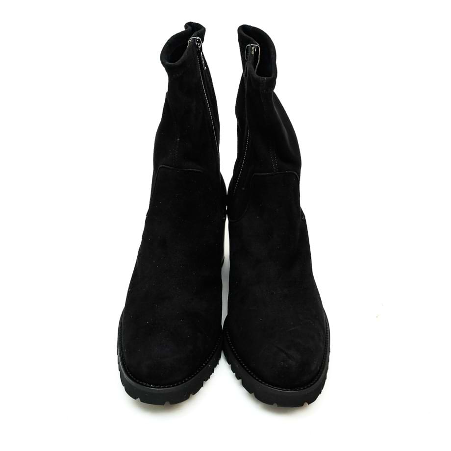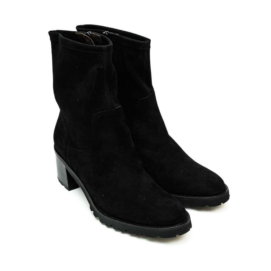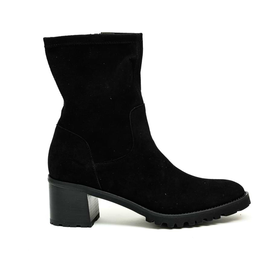 Poluduboka čizma izađena od velur kože crne boje. Zatvara se zipom a gornji deo je u streču. Unutrasnjost je postavljena kožom. Đon je od gume a visina stabilne pete 6 cm.