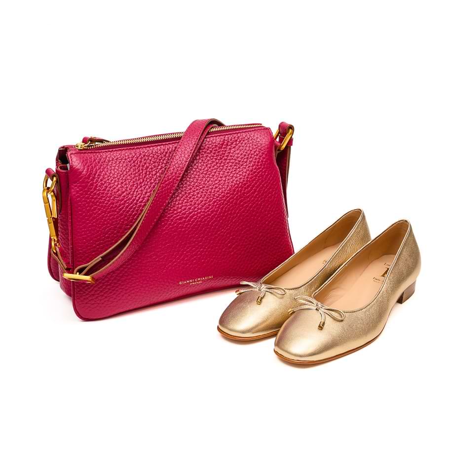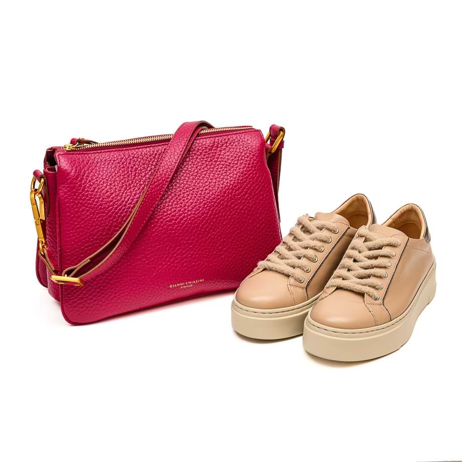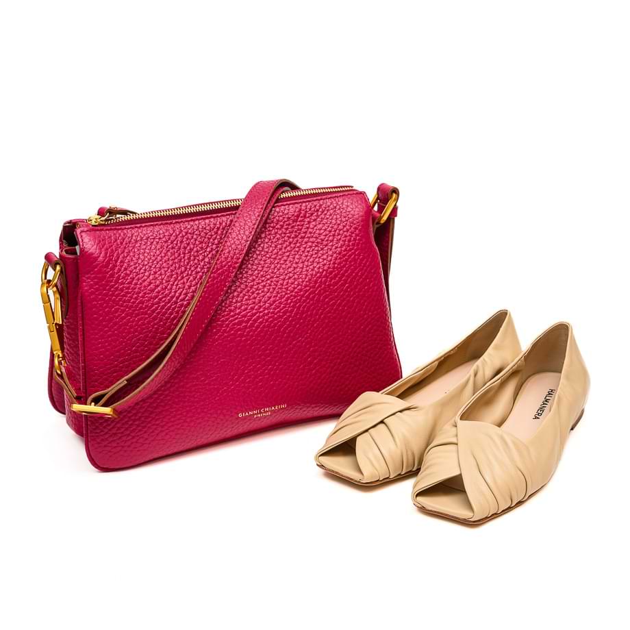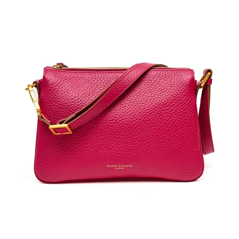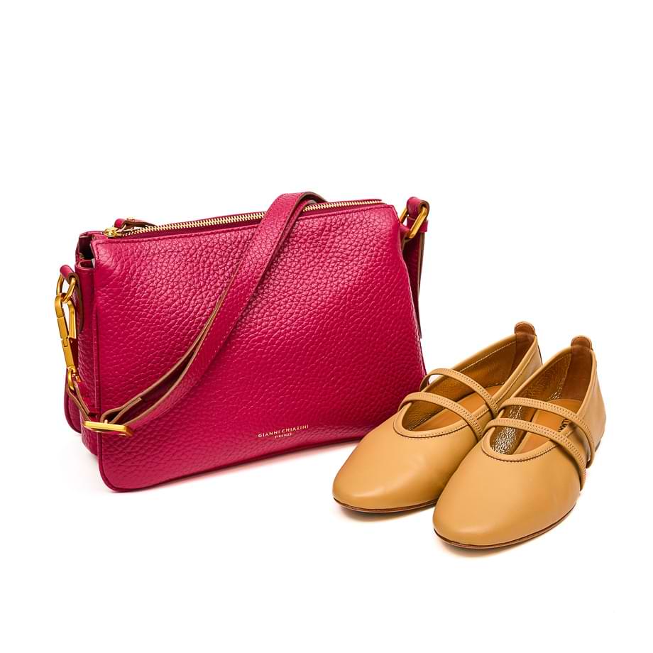 Tašna izrađena od zrnaste kože ciklama boje. Unutrašnjost je postavljena tekstilom i poseduje dve centralne pregrade i dva đžepa u srednjem delu. Zatvara se pomoću zipa. Poseduje podesivi kožni kaiš za nošenje preko ramena.