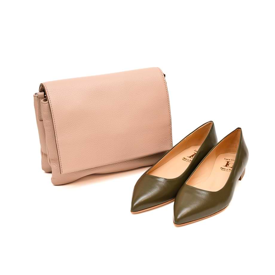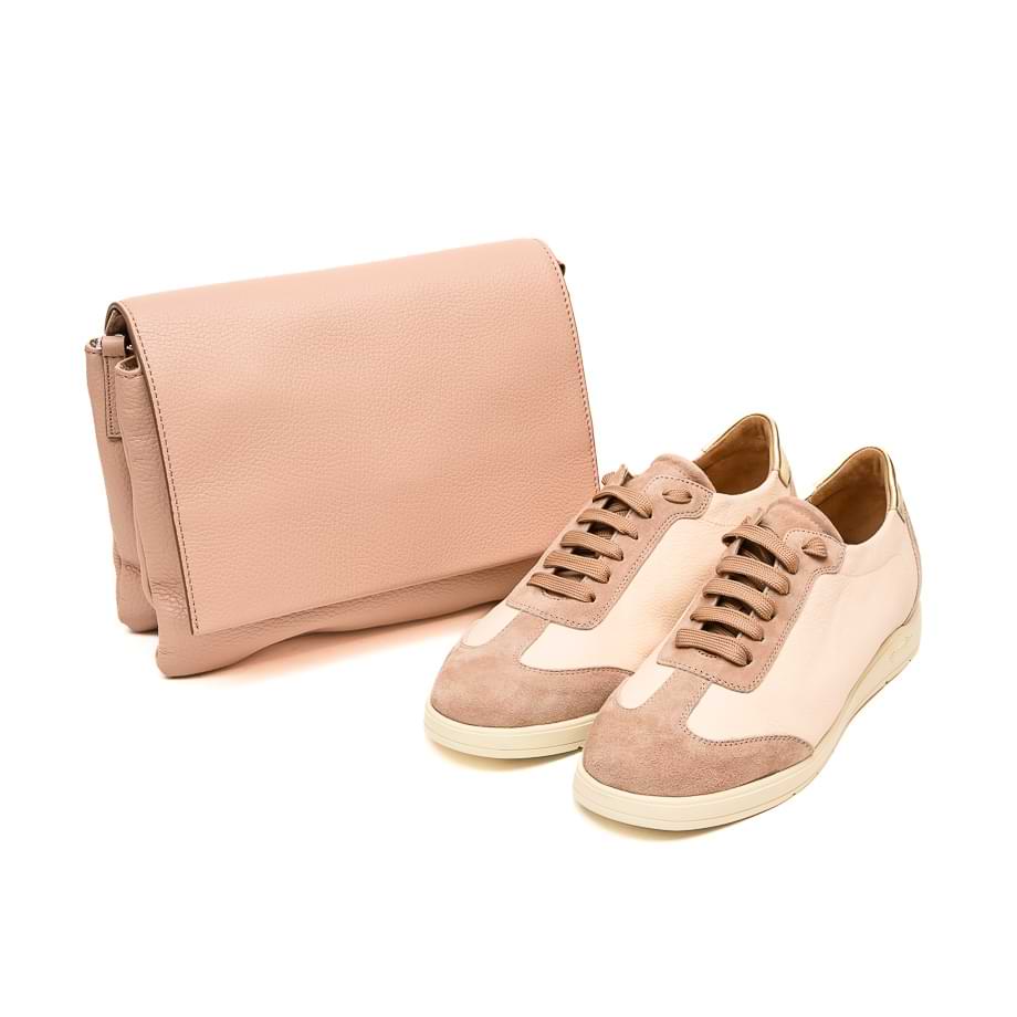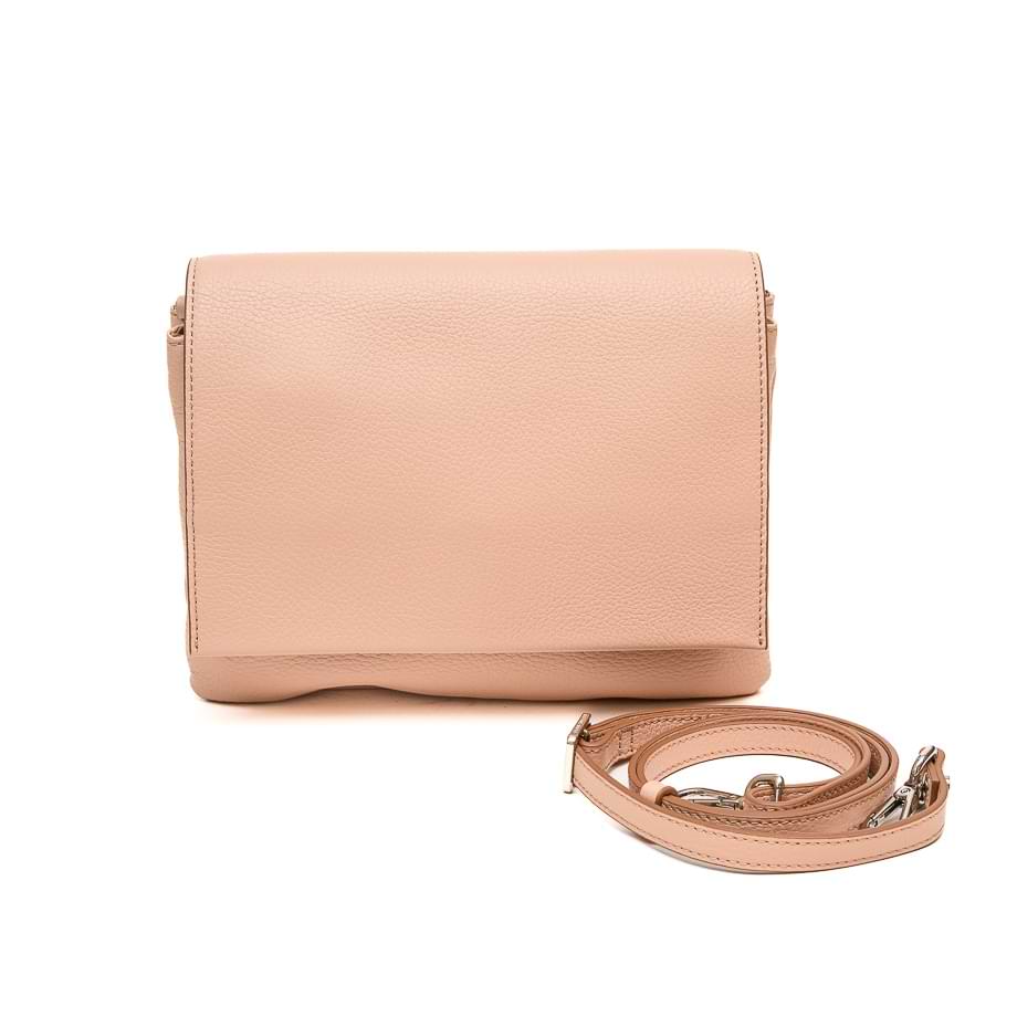 Tašna izrađena od zrnaste kože u puder roze boji. Unutrašnjost je postavljena tekstilom, poseduje centralnu pregradu i đžep na prednjoj strani koji se zatvara zipom kao i sama tašna.Preklop se zatvara pomoću magneta. Dodatni podesivi kaiš omogućuje nošenje preko ramena.