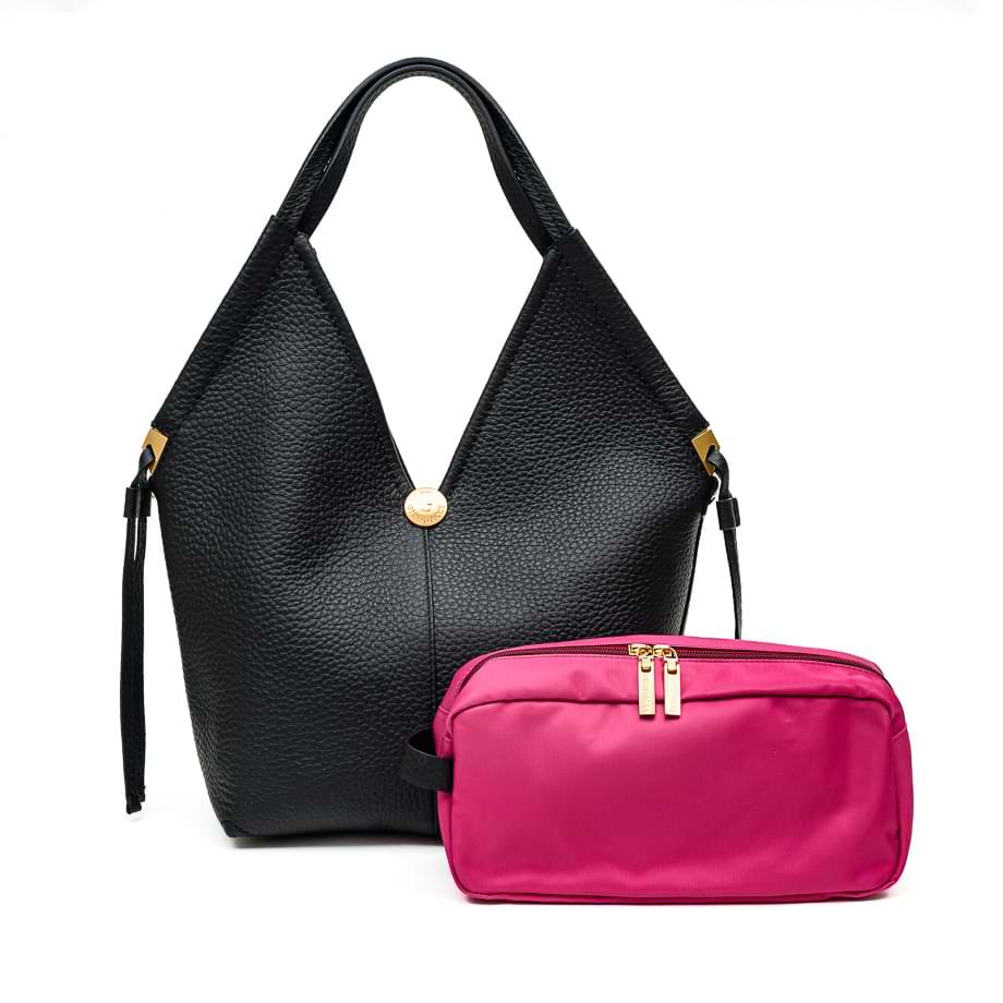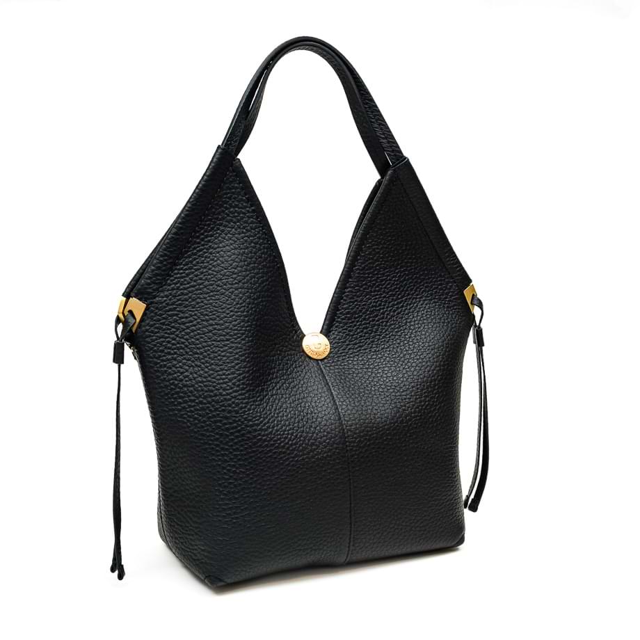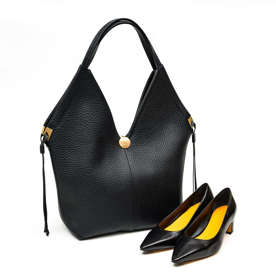 Ručno izradjena tašna za rame od mekane premijum kože sa teksturom, crne boje, sa detaljima mat zlatne boje. Zatvara se na magnet. Unutrašnjost je od kože sa centralnom pregradom i četiri bočne, od kojih su dve sa zipom. Poseduje neseset od tekstila ciklama boje, sa kožnom ručkom.