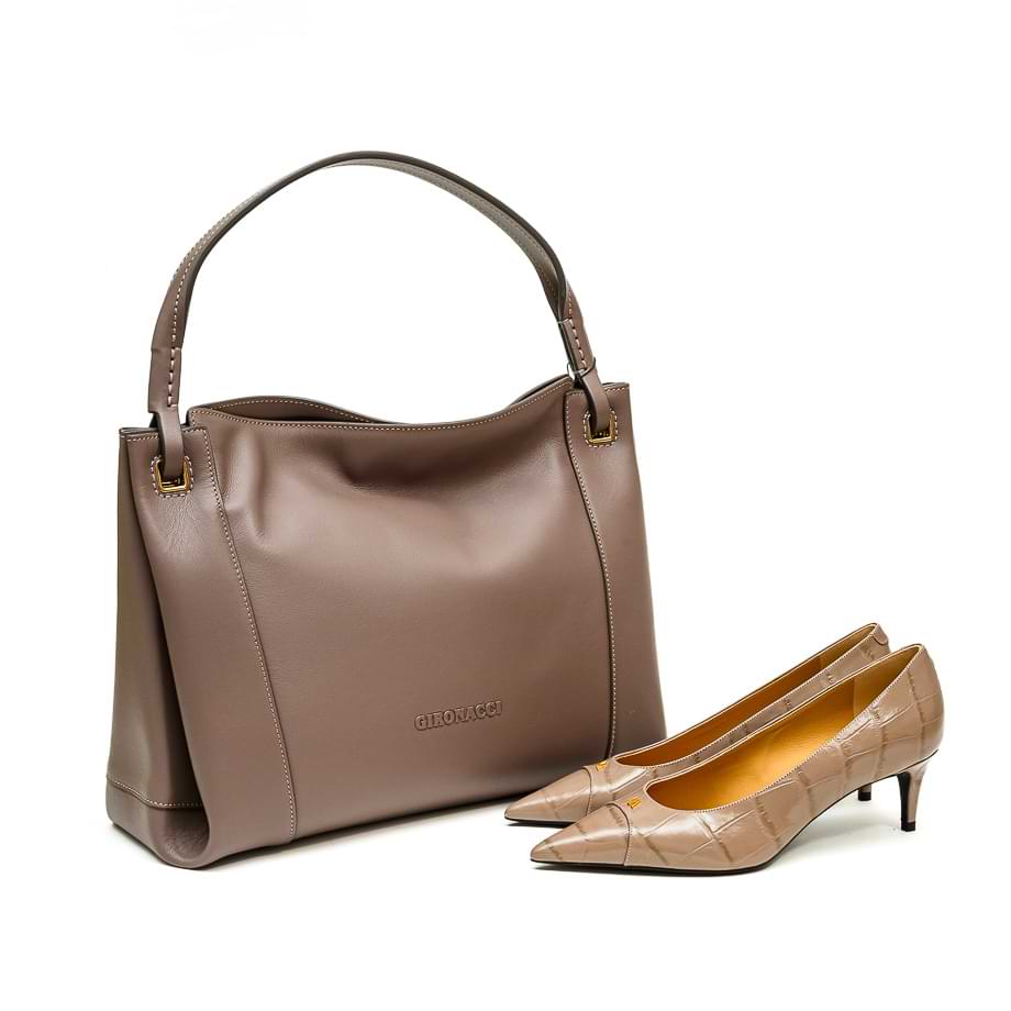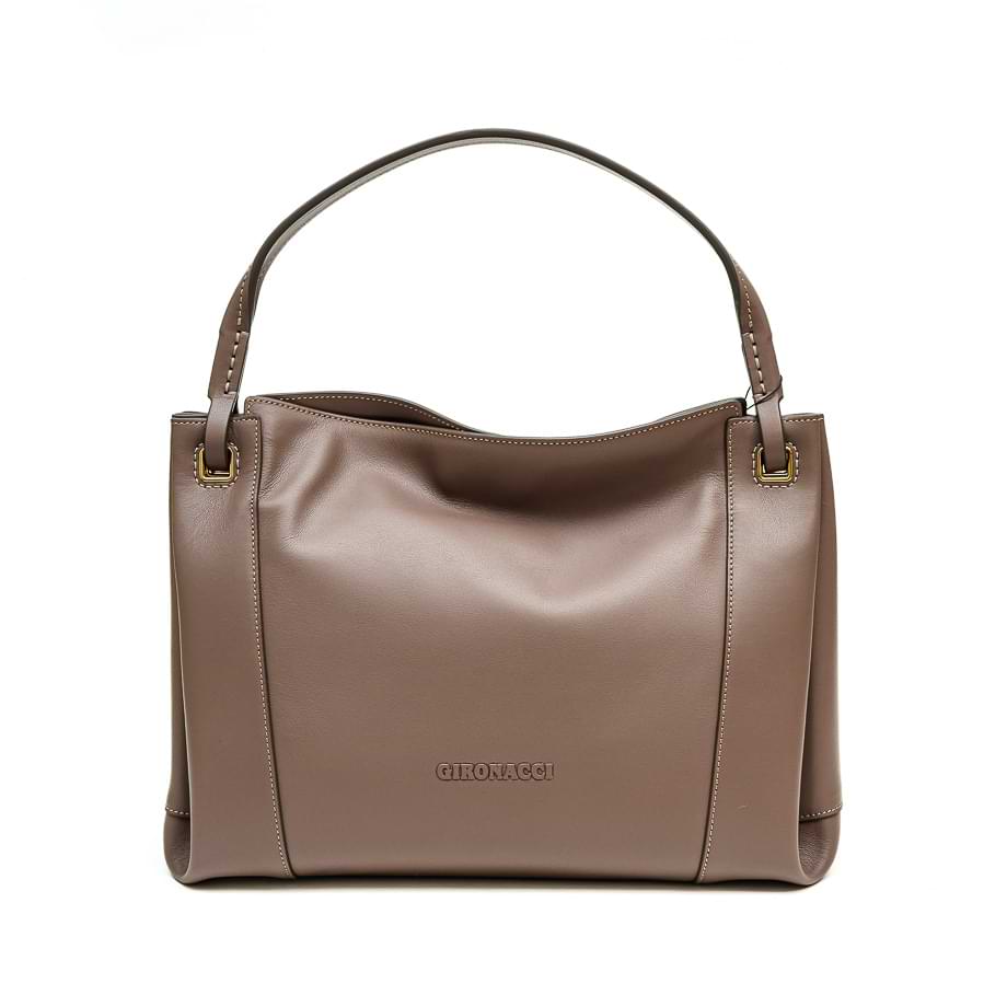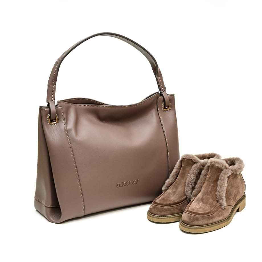 Ručno rađena tašna za rame od najmekše teleće kože taupe boje. Zatvara magnetom. Unutrašnjost je od kože, sa jednom centralnom i dve bočne veće pregrade od kojih se jedna zatvara zipom. Dimenzije: 35 x 27 x 10 cm.