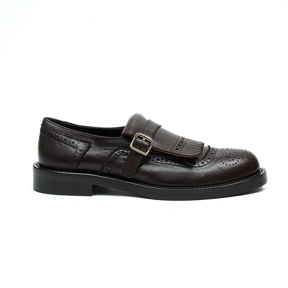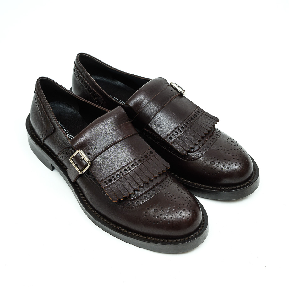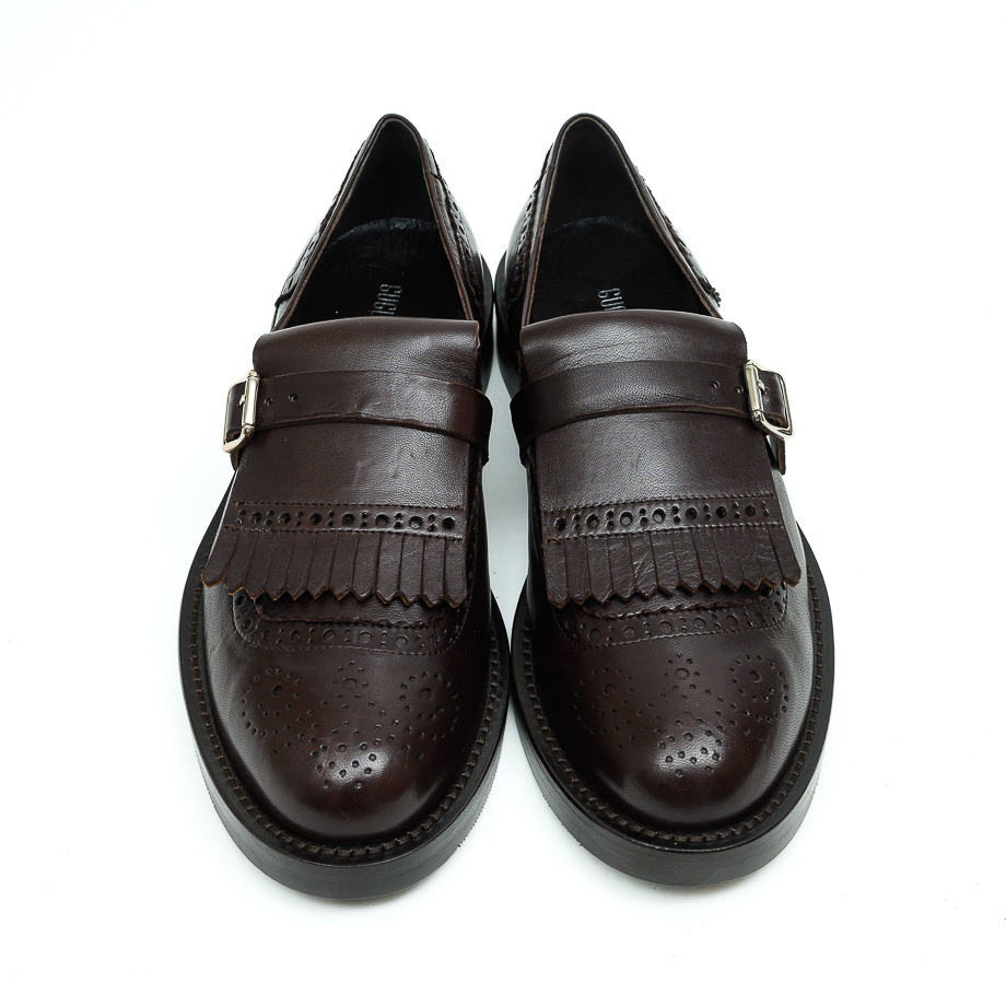 Mokasina izrađena od natur kože braon boje. Ukrsšena je zumbicama i resama preko risa. Unutrašnjost je od kože. Đon je od kože presvučen gumom. Visina đona je 1,5 cm, a slagana peta je 2,5 cm.