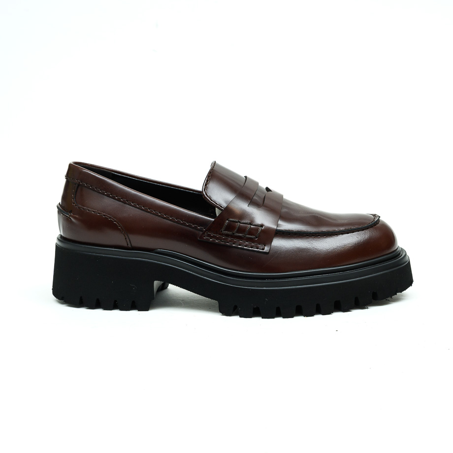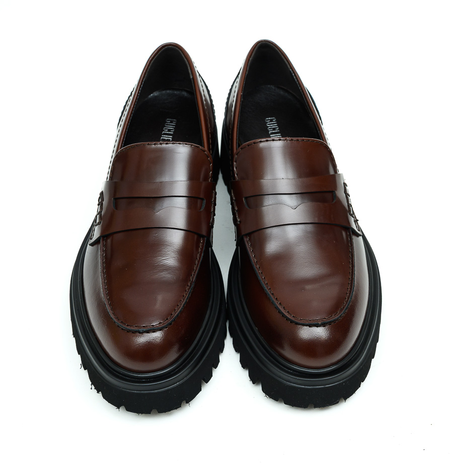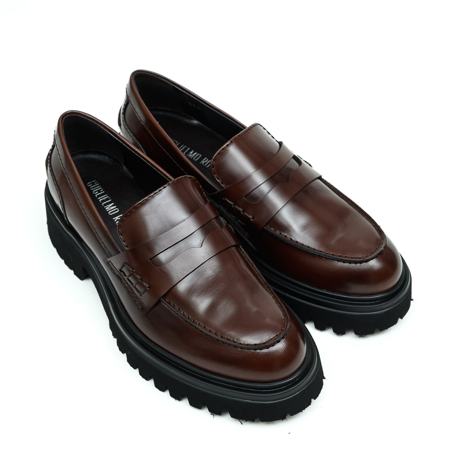 Mokasina izrađena od sankar kože braon boje. Unutrašnjost je postavljena kožom. Đon je od gume, visine 2,5 cm, a u predelu pete je 4,5 cm.