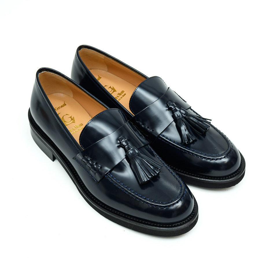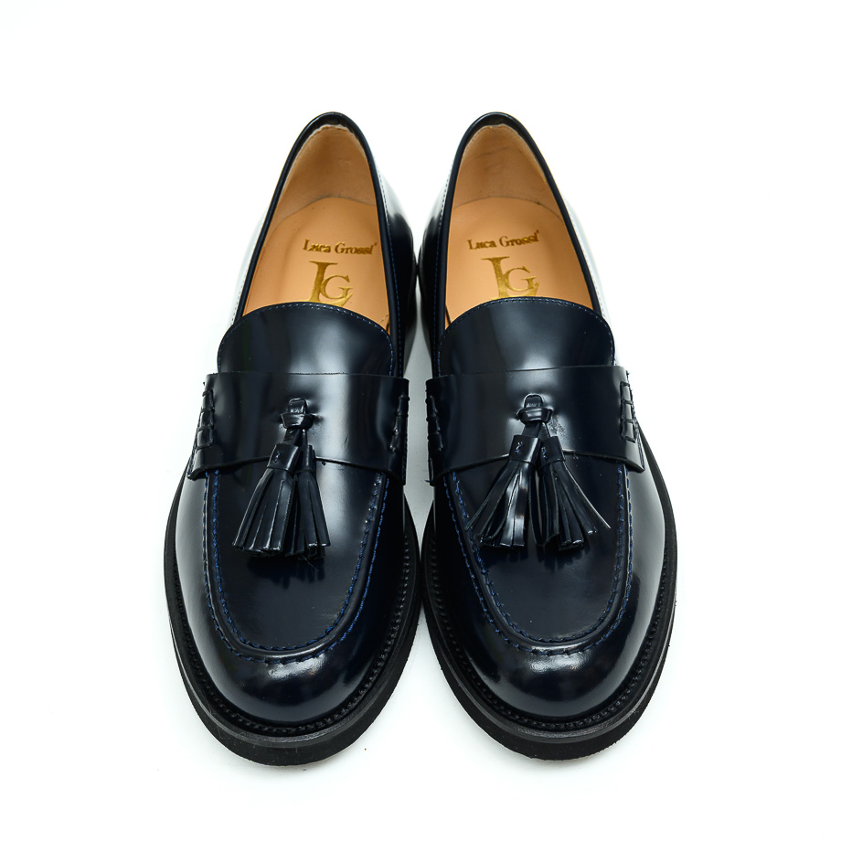 Mokasina izrađena od sankar kože teget boje sa ukrasnom kićankom sa prednje strane. Unutrašnjost je postavljena kožom. Đon je od gume u prednjem delu visine 1.5 cm, a visina slagane pete je 3 cm.