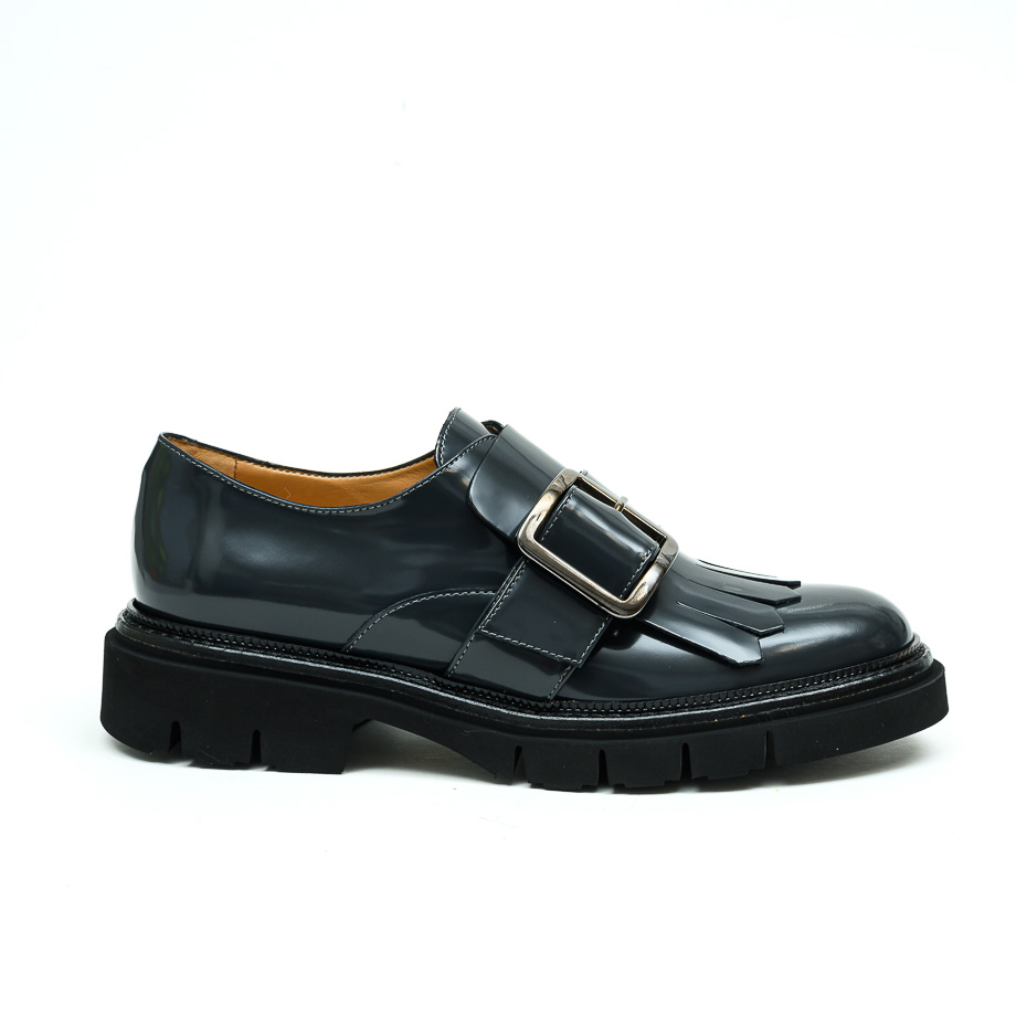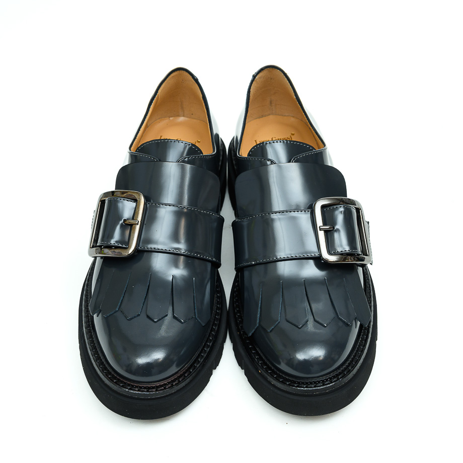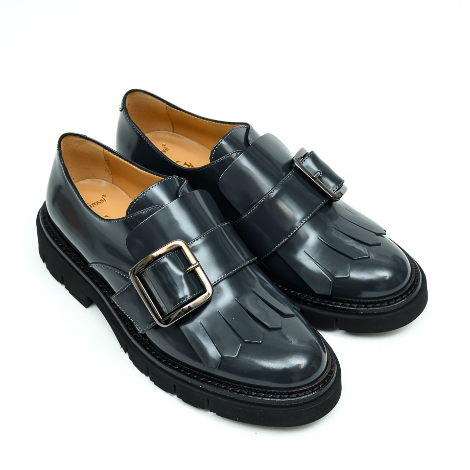 Mokasina izrađena od kože visokog sjaja sive boje sa resama i kaišem preko risa. Ukrašena je kopčom u boji srebra bočno. Postavljena je kožom. Đon je od lagane gume. Visina đona je 2 cm, a u predelu pete 3,5 cm.