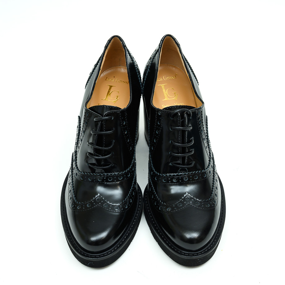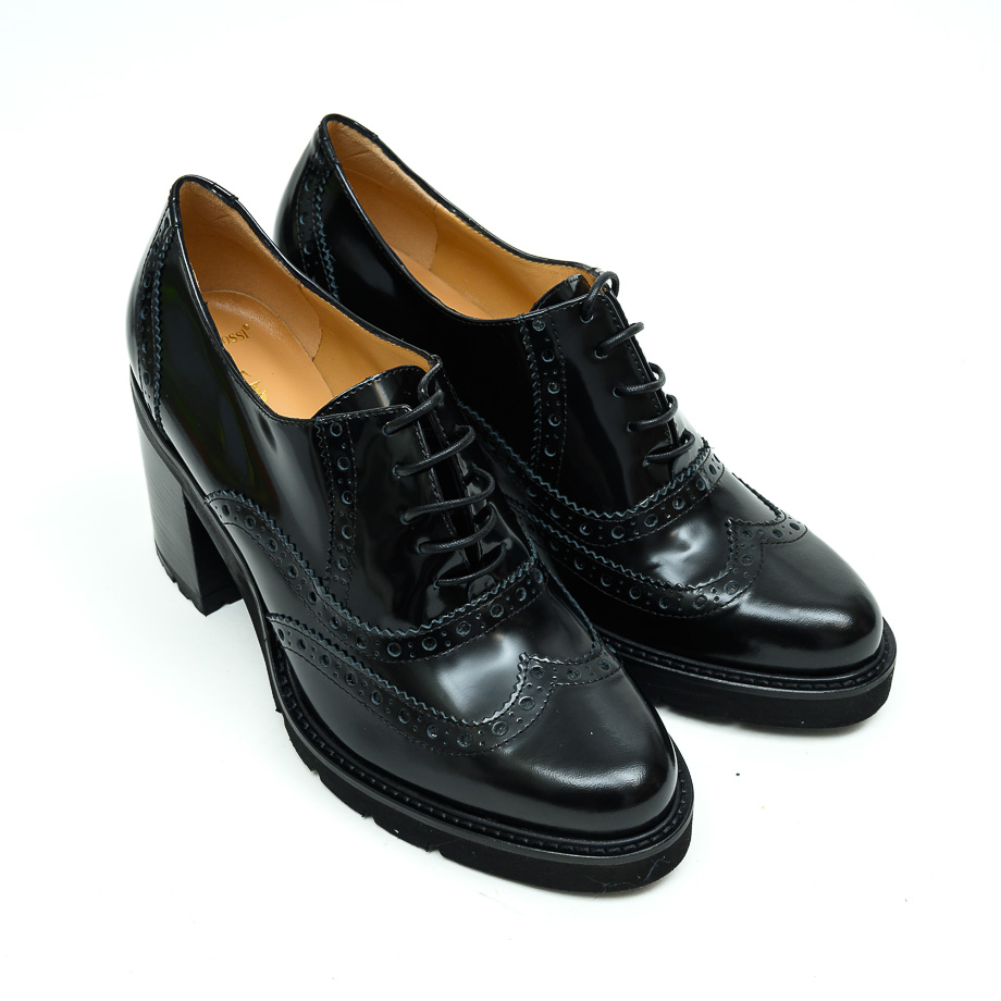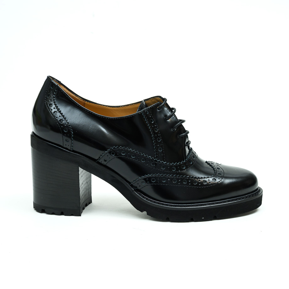 Cipela izrađena od kože visokog sjaja crne, zumbana na šniranje. Postavljena je kožom. Đon je od gume sa platoom visine 1.5 cm a slagana peta je visine 8 cm.