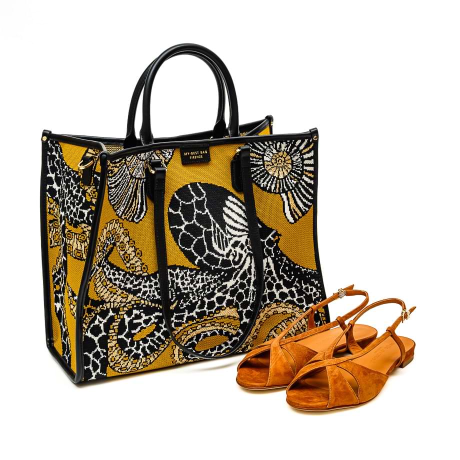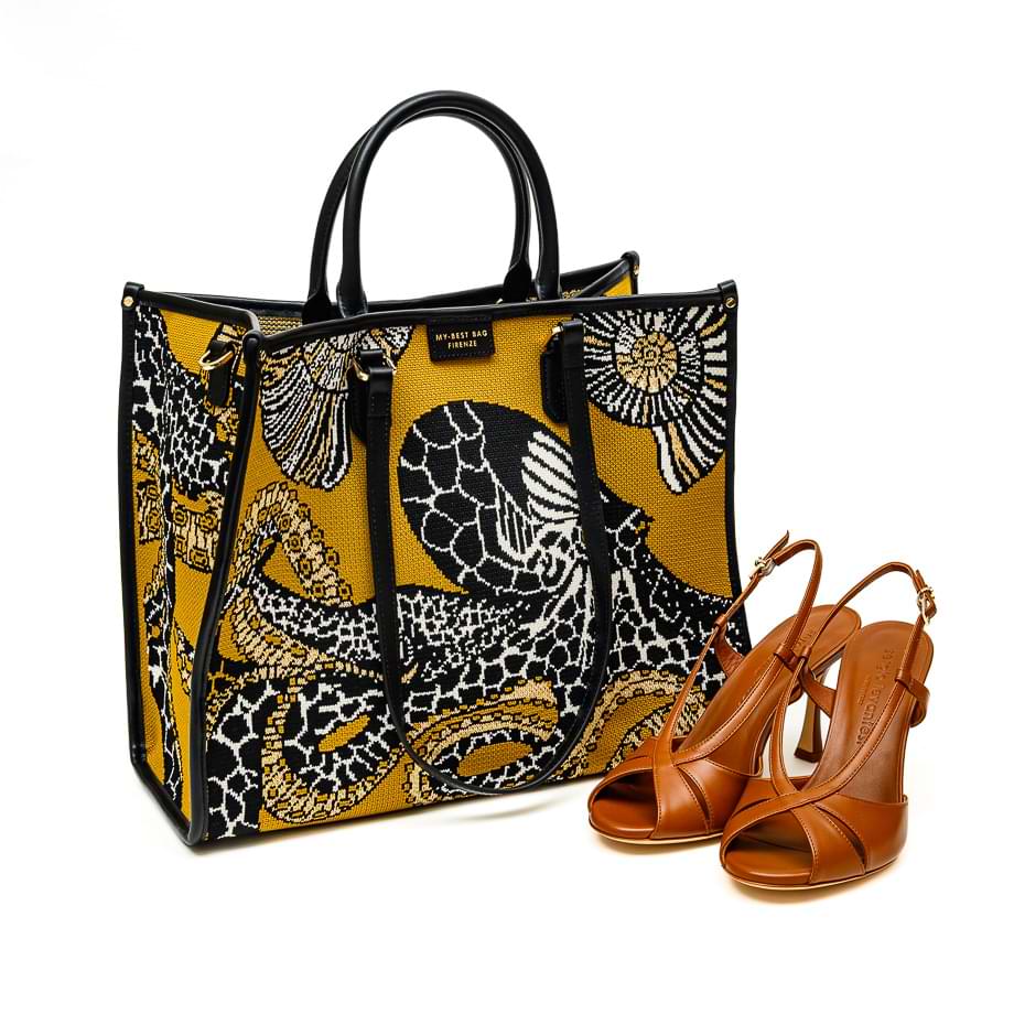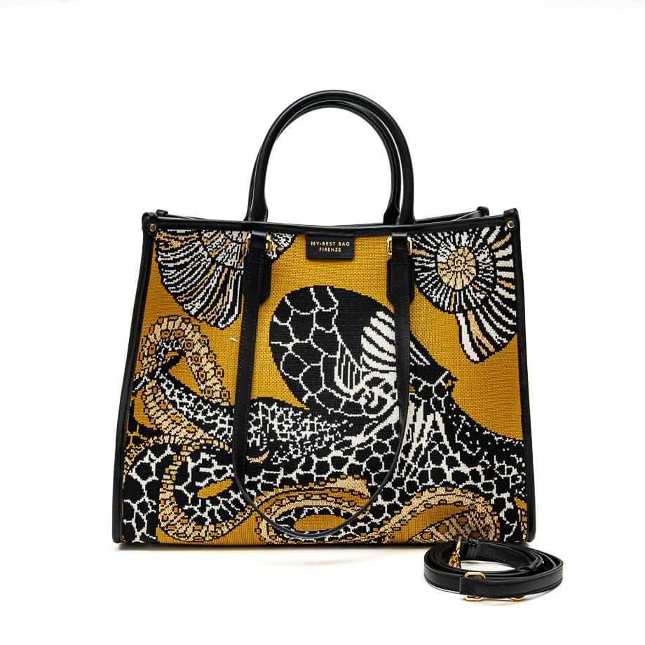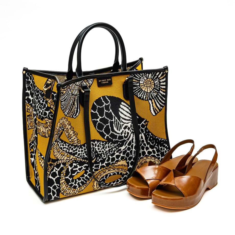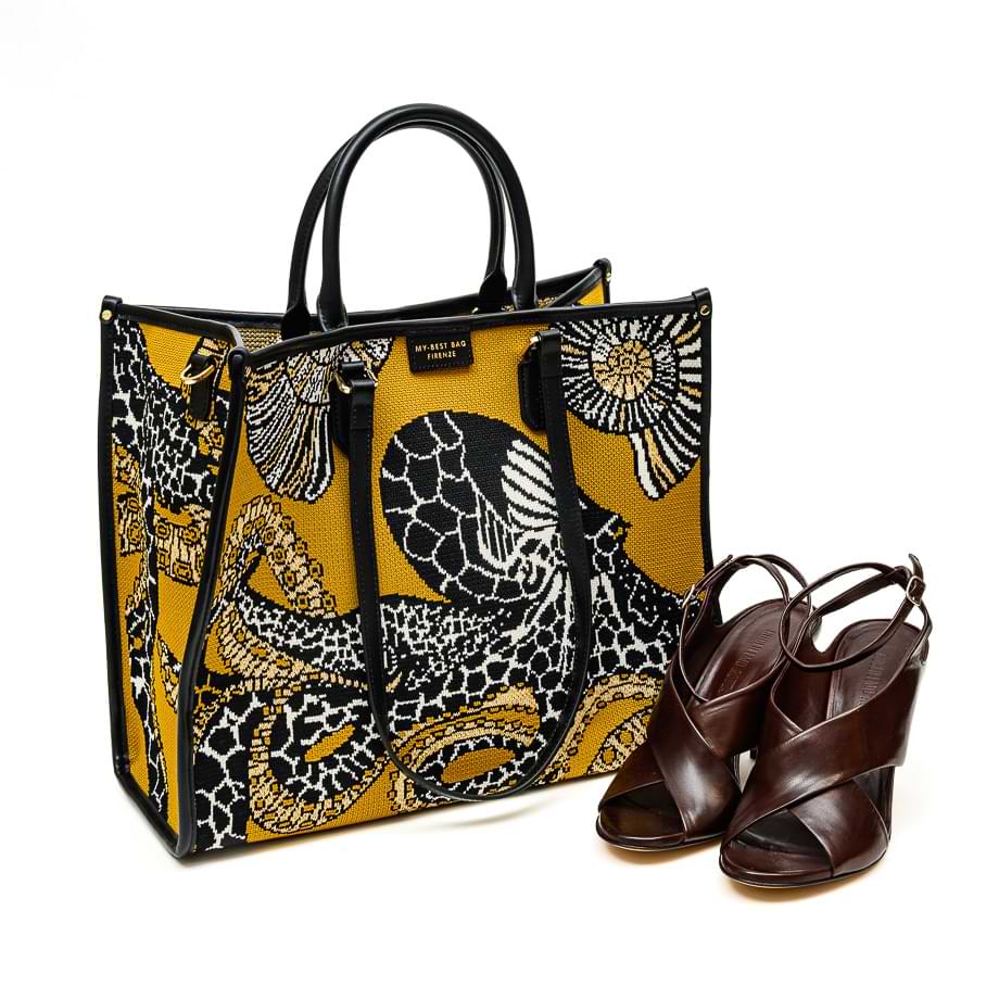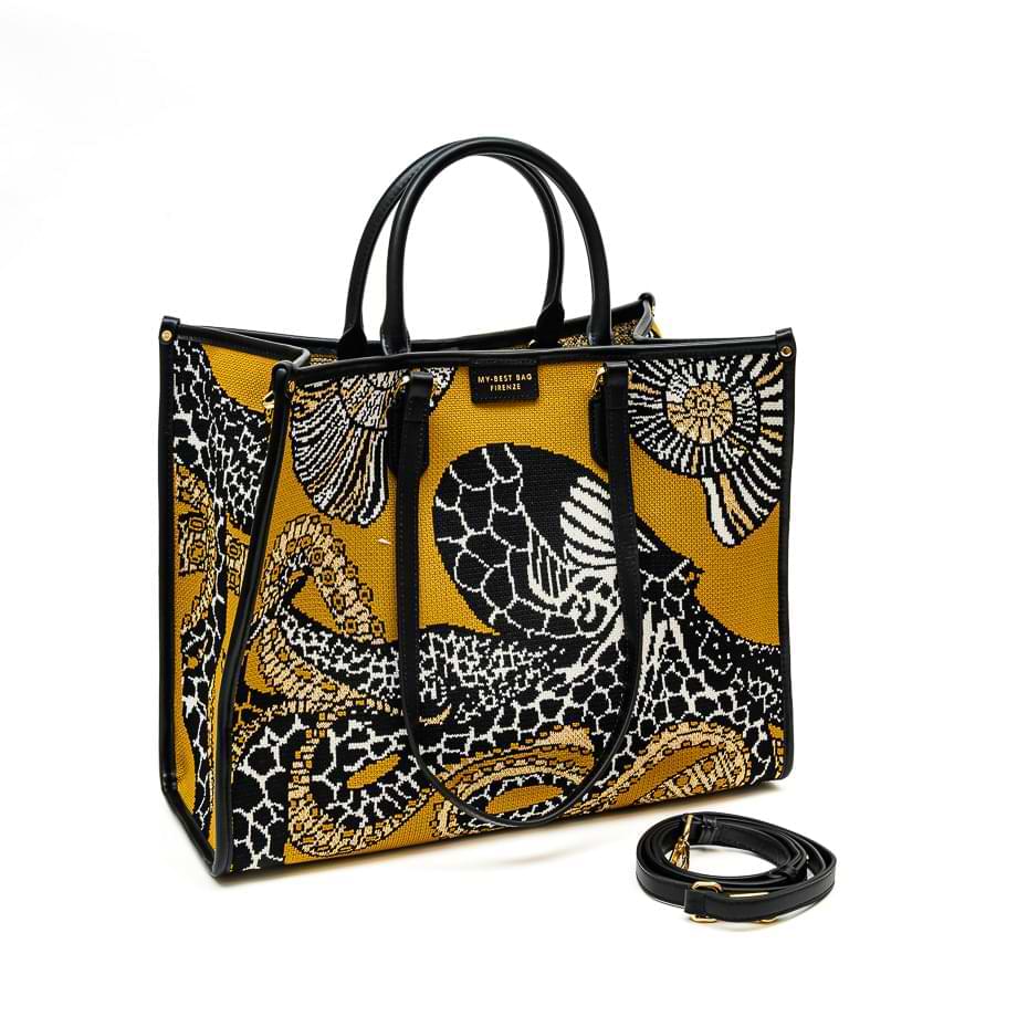Tašna većeg formata izrađena od sofisticirane mešavine teksturisane tkanine sa motivom hobotnice i premijum kože. Zatvara se okretnim karabinerom u boji zlata. Poseduje dva para krutih, kožnih ručki: kraće za nošenje u ruci i duže za nošenje preko ramena. Nije postavljena. Dno je ojačano, od kože je obostrano. Poseduje veliki neseser koji je sa obe strane zakopčan karabinrom.