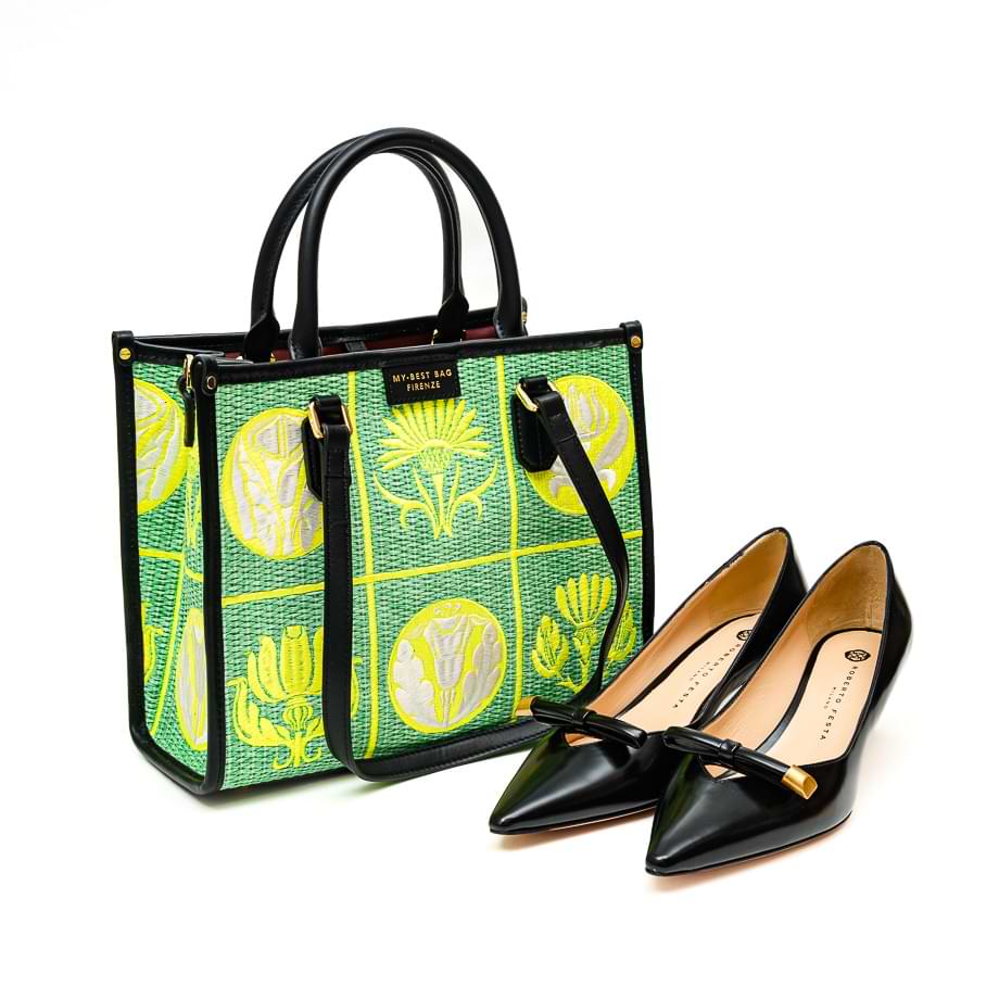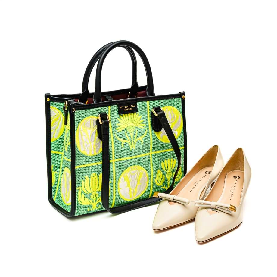 Tašna srednjeg formata izrađena od sofisticirane mešavine teksturisane tkanine sa cvetnim motivima i premijum kože. Zatvara se okretnim karabinerom u boji zlata. Poseduje dva para krutih, kožnih ručki: kraće za nošenje u ruci i duže za nošenje preko ramena. Nije postavljena. Dno je ojačano, od kože je obostrano. Poseduje veliki neseser koji je sa obe strane zakopčan karabinrom.