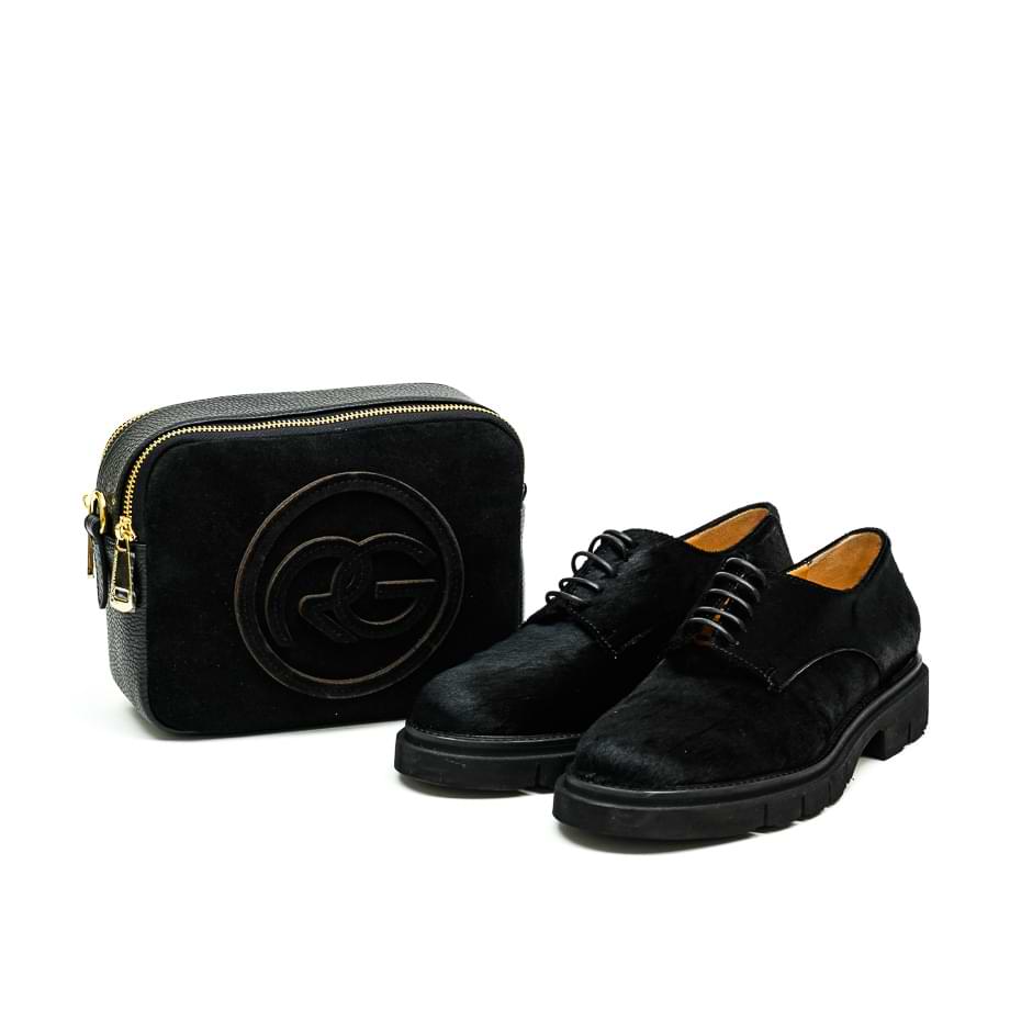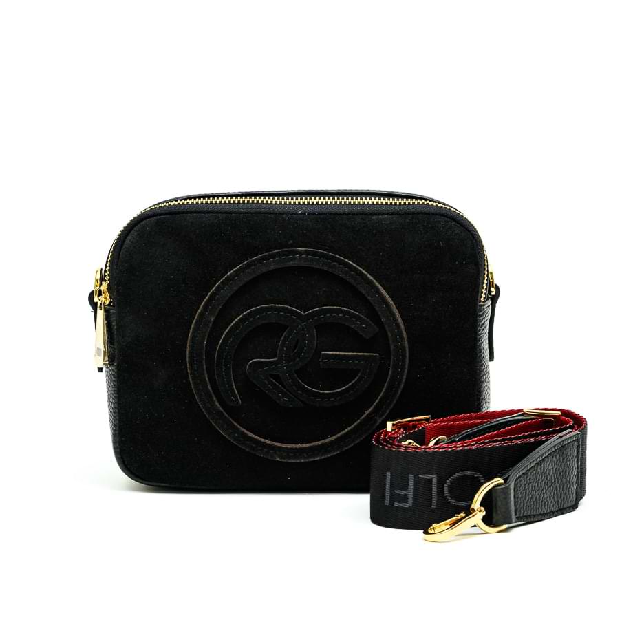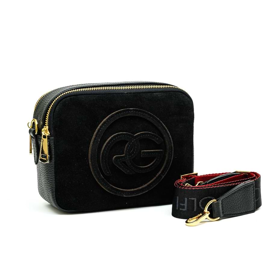 Praktična tašna manjeg formata izrađena u kombinaciji mekane granulaste kože i velura sa spoljne strane, crne boje. Ima dve fizički odvojene pregrade koje se zatvaraju zipom. Postavljena je tekstilom. Kaiš je tkani. Sa spoljne strane je crne boje, a sa unutrašnje je prugast u bojama: petrolej, crna, bež i crvena.  Dimenzije: 20 x 16 x 7.5 cm.